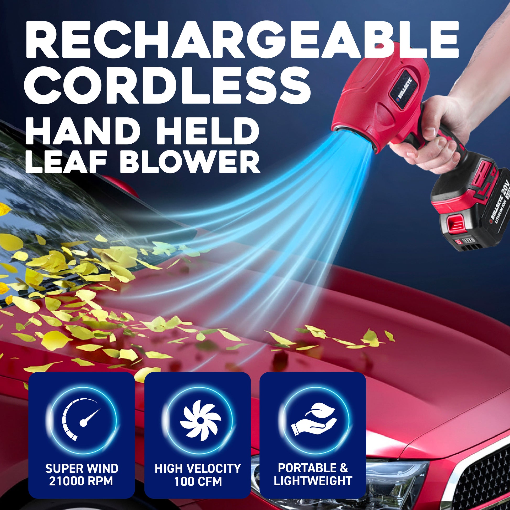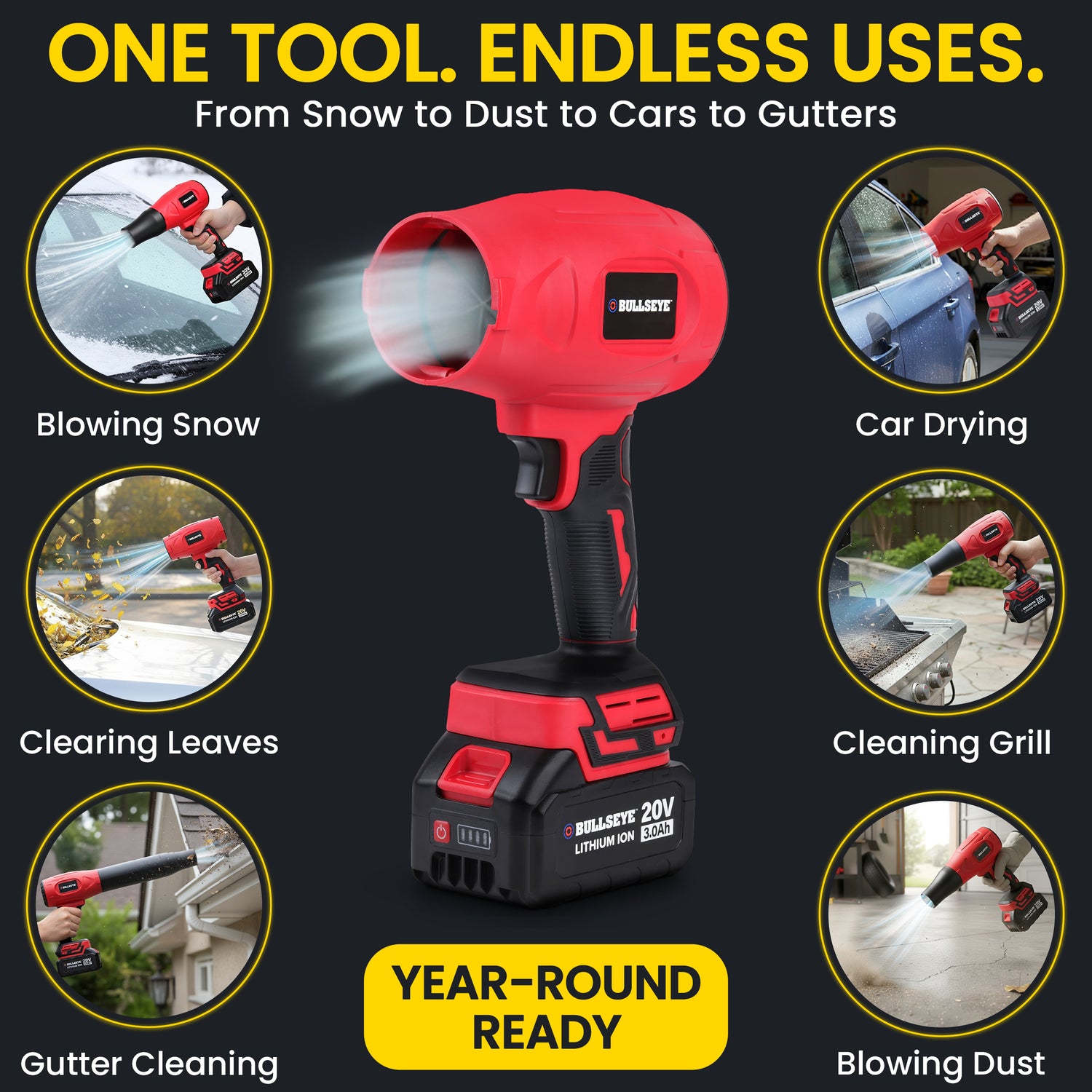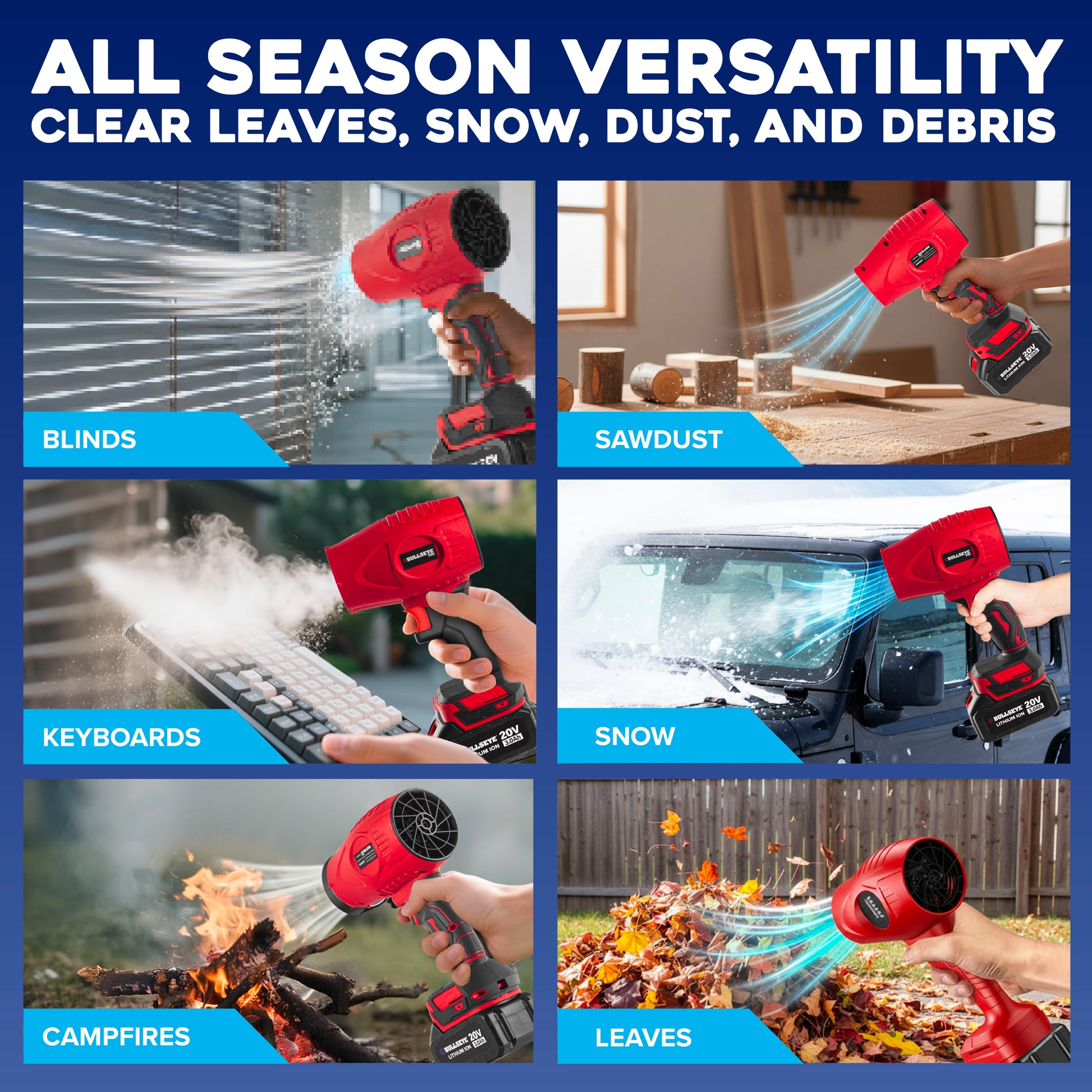Meet the Bullseye Blower — your all‑in‑one rechargeable air blower engineered to make yard work, cleaning, and detailing faster and easier than ever before. Whether you’re clearing leaves, dust, dirt, or even light snow, this tool delivers professional‑grade airflow without the hassle of cords or heavy gas blowers.
